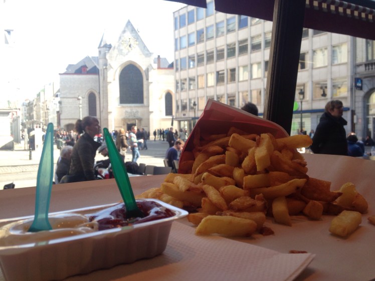 After the tour, along with some others from our walking tour we went and got fries from Fritland. They were delicious and reminded me of the fries from the Minnesota State Fair, but better. We had the choice of sauce and I ended up going with classic ketchup but we when back later and tried the sauce called pita! ( I know 2 fries in 2 days but we are in Brussels!) Later we met up with the same people from the walking tour for dinner and drinks. You walk down this main food street and they really sell you since all of the restaurants serve basically the same thing at the same price. I got steak again because it was the same price as everything else and I am really going to miss steak once I get back to Vienna and have to pay 40€ to make it myself!