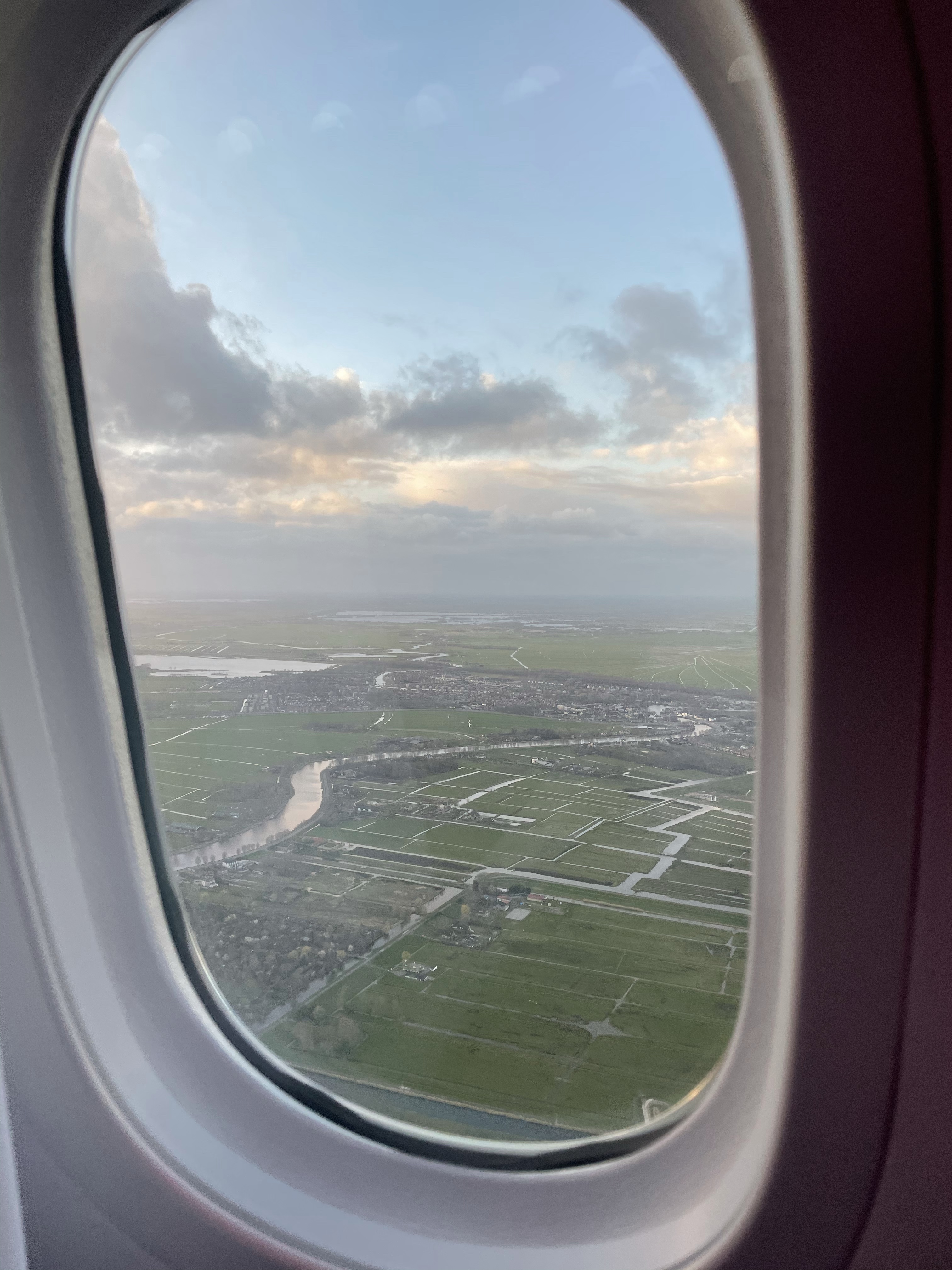 We each got about 3 hours of sleep as we wanted to take in the full business class experience. It was nice to have a bed laying down to stretch out on. We had a sunny landing, although we are still a little early to see the tulips from the sky! Give it 2-3 weeks and all of those green fields will be tulips