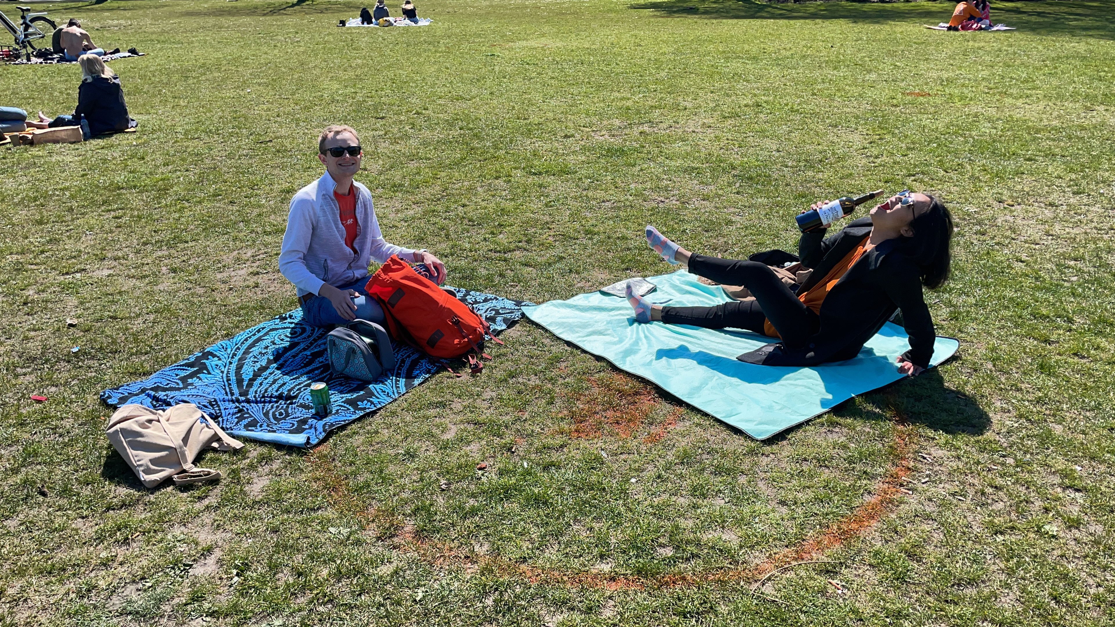 We got to the park around 1 and it was nice that they had circles mapped out to help control people and it wasn’t super busy when we arrived. Although, by 4 it was bumping! We ran to get a few drinks and run to the bathroom outside the park and came back to all the entrances closed off my the police and all of our stuff inside…. thankfully a new friend was on her way out and brought our stuff for us as the police could care less. I have mixed opinions on closing the parks. On one hand, it was starting to get busy, but only in a few sections and honestly better for people to party outside than giant indoor parties. Plus, we were about to learn how the city center was much crazier!
