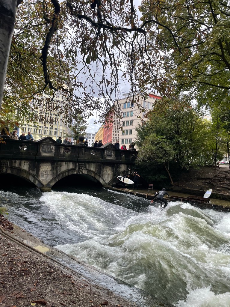 We wandered in the rain a bit, got some souvenirs and headed back into the city center to see the famous surfer on the river and the town hall.