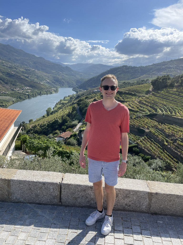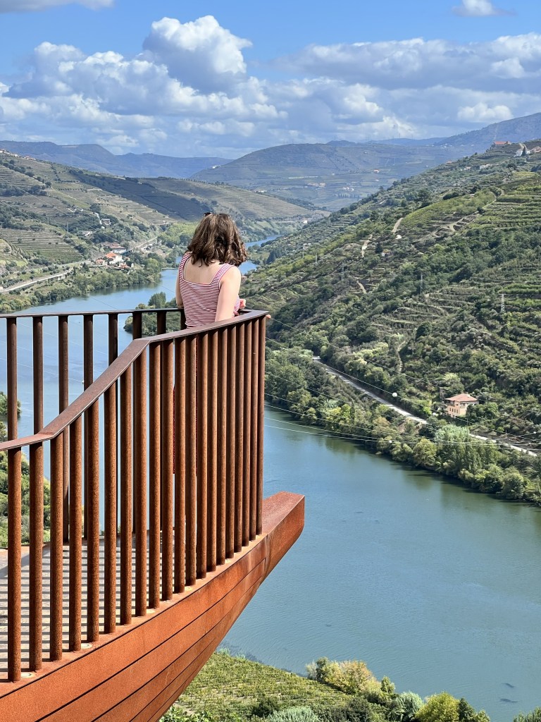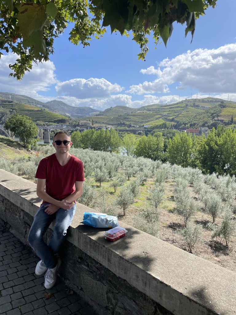 Our first day included beautiful drives and a private boat ride down the river with a glass of wine. We thankfully made it just in time for our boat ride, but we made so many stops at views along the way that we were almost late. Below you can see Ryan eating a super quick grocery store sandwich for lunch. Look at the views though on the side of the road! I think my favorite area was around this viewpoint- Miradouro Barqueiros.